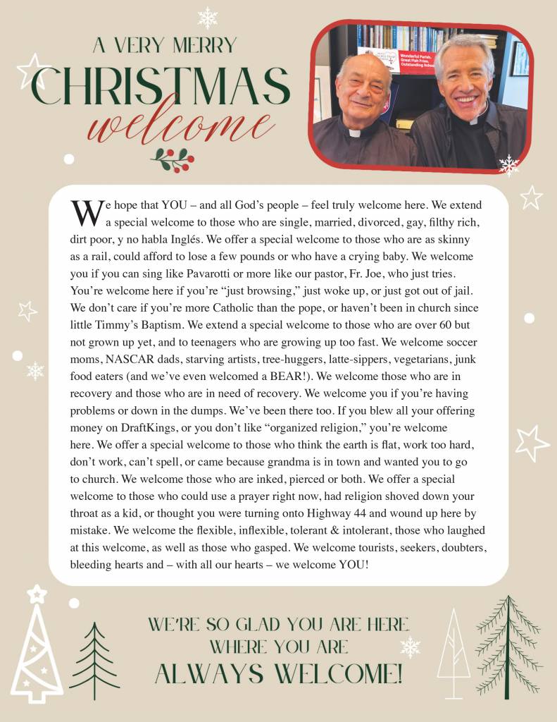 For Christmas Masses, the doors to school and Father Dowling Hall will be unlocked. If you park in our small back parking lot, you may cut through the school lobby or the east doors (closest to the Rectory) to make your way over to Church. When leaving the back parking lot, please exit down the back drive (do not use the cut-through to our main parking lot).